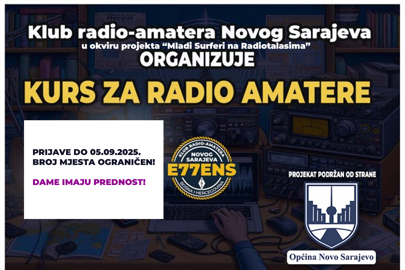 Kurs će se realizovati u okviru projekta “𝐌𝐥𝐚𝐝𝐢 𝐒𝐮𝐫𝐟𝐞𝐫𝐢 𝐧𝐚 𝐑𝐚𝐝𝐢𝐨𝐭𝐚𝐥𝐚𝐬𝐢𝐦𝐚” koji je podržan od strane Općina Novo Sarajevo